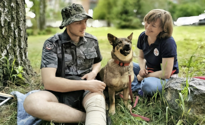 Therapiehündin Busia sitzt ruhig zwischen einem verletzten, ukrainischen Soldaten, der sichtlich Freude an dem Vierbeiner hat, und einer Psychologin. In Winnyzja in der Zentralukraine bietet die Hündi…